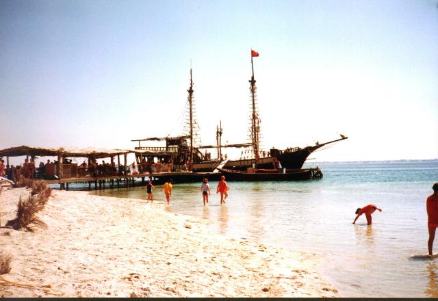 On Wednesday we went sailing. We had booked a trip on a boat which started in the harbour of Houmt Souk and took us out to Flamingo Island - so called because it's the winter residence of hundreds if not thousands of pink flamingos. However, when we went there all the flamingos were somewhere else in the world. The water around Djerba is very shallow. In fact, they had to dig a canal 8 kilometres long and 75 metres wide to get to deeper waters. It is possible to walk from Djerba to the mainland during low-tide. On the way out we stopped and had the chance to swim in the Mediterranean for a while. The water was nice and warm and incredibly salty. It's fun to jump off a boat - especially when it's not burning or sinking...